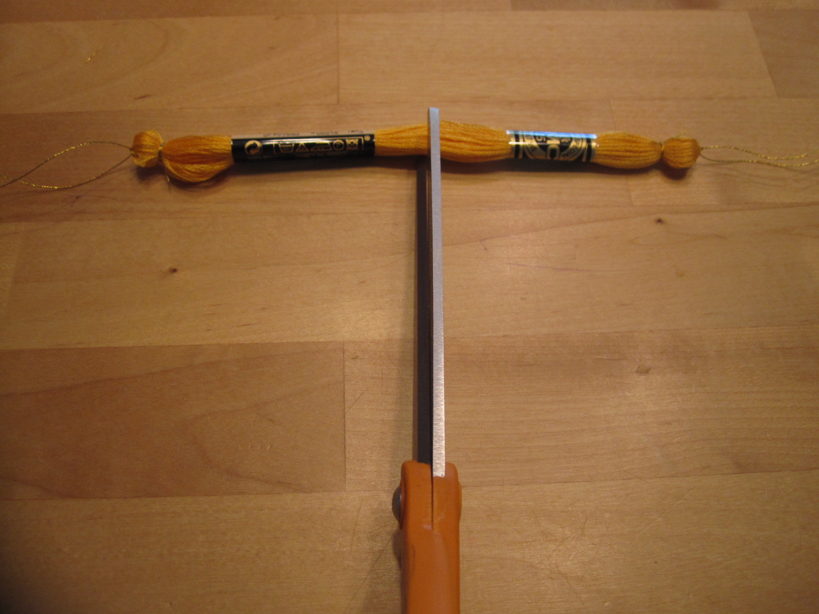 Thread a 12-inch piece of gold embroidery floss (or any color) through the loop end of a embroidery floss skein. We used yellow and red.